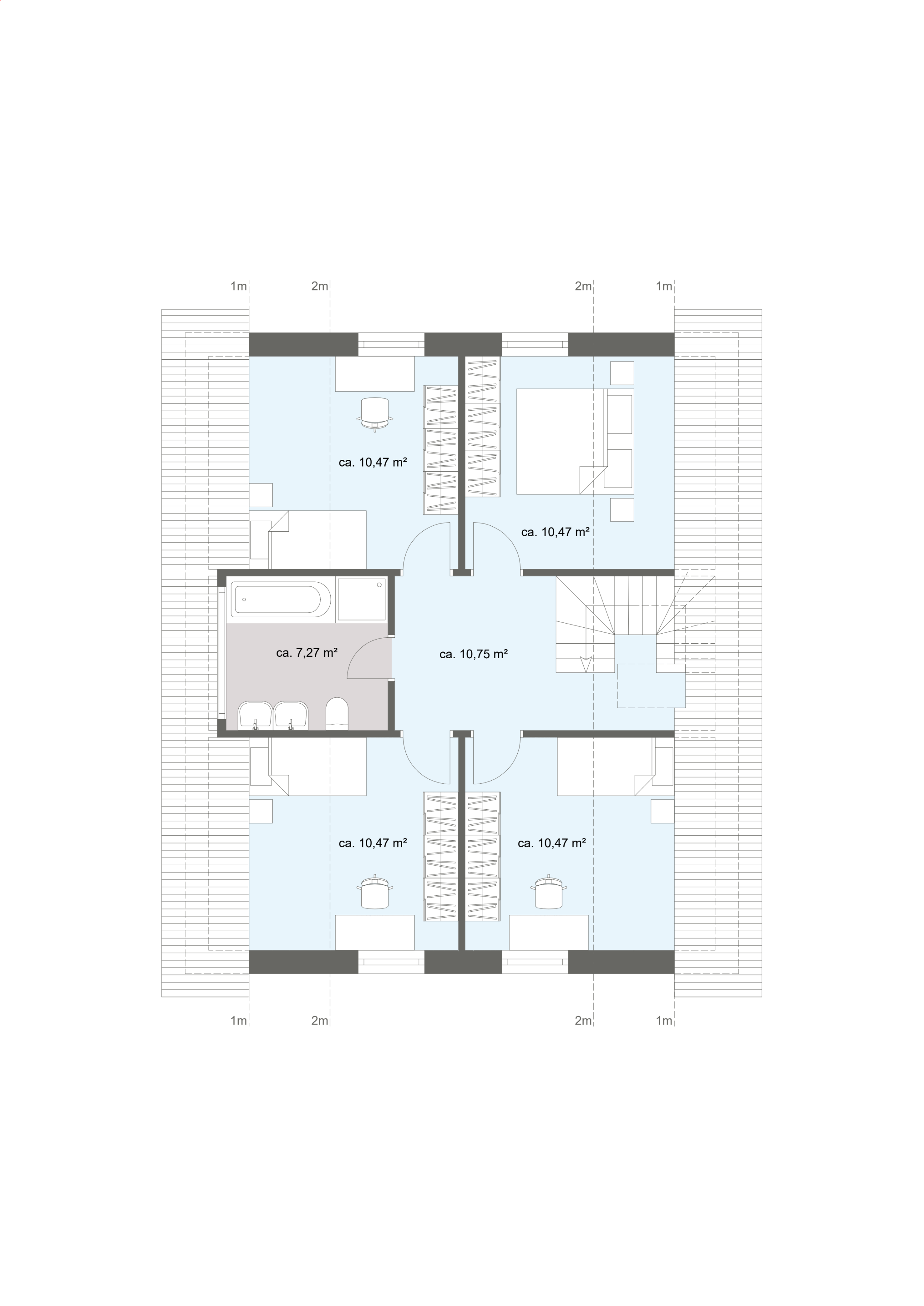 Die oberen Etagen sind in mehrere Zimmer mit jeweils zugeordneten Badezimmern gegliedert. Die Ausstattung der Bäder stammt überwiegend aus den 1970er- und 1980er-Jahren und ist modernisierungsbedürftig. Auch das Dachgeschoss verfügt über genehmigte Flächen sowie zusätzliche ausgebaute Bereiche, die weitere Nutzungsmöglichkeiten eröffnen.