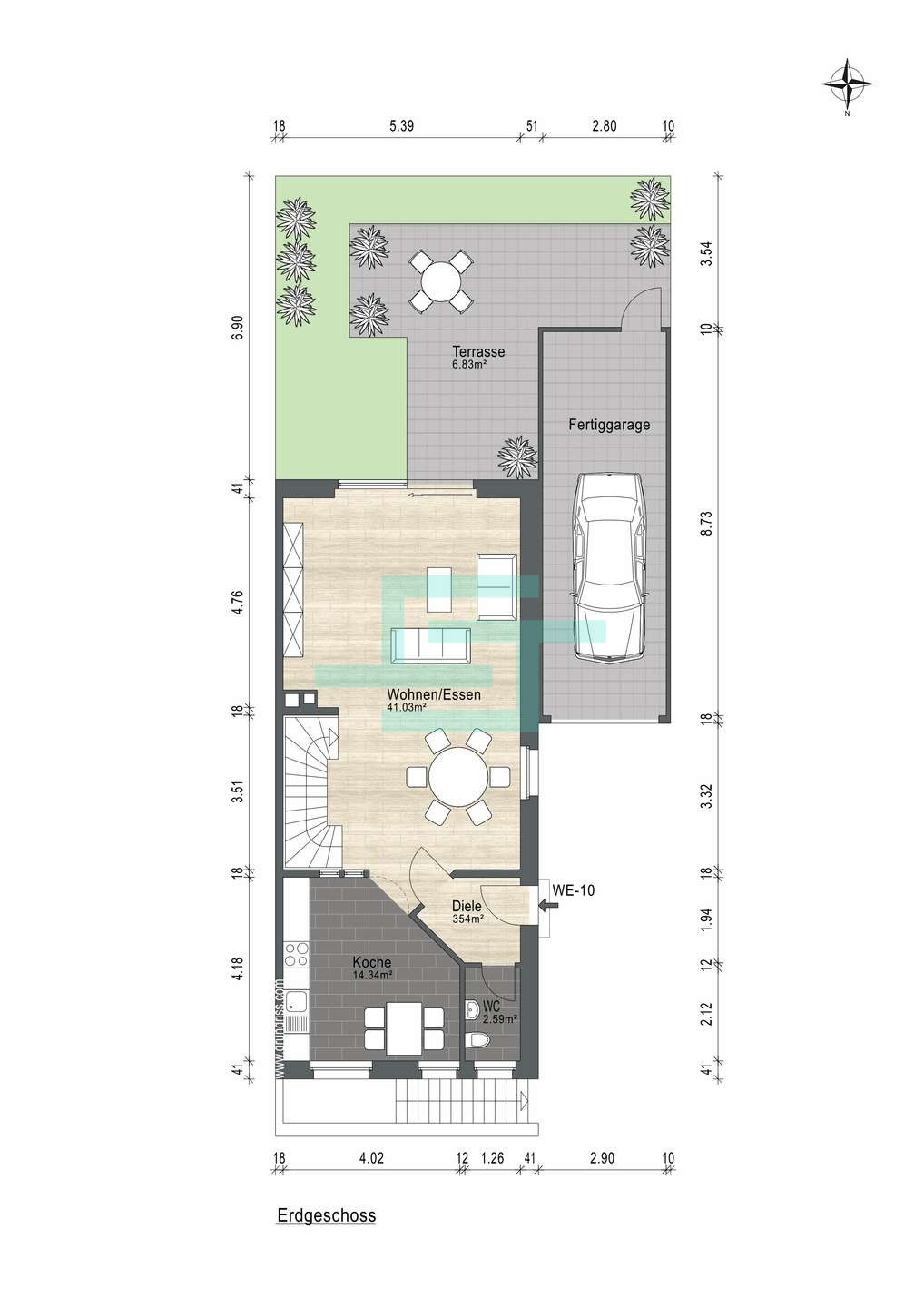 Der Eingangsbereich im Erdgeschoss empfängt Sie mit einem separaten Gäste-WC. Von hier aus gelangen Sie direkt in den großzügigen Wohnbereich mit offener Gestaltung. Links befindet sich die Küche, während der Wohn- und Essbereich durch eine große Fensterfront mit Schiebetüren geprägt ist, die einen direkten Zugang zur Terrasse und in den Garten ermöglicht.